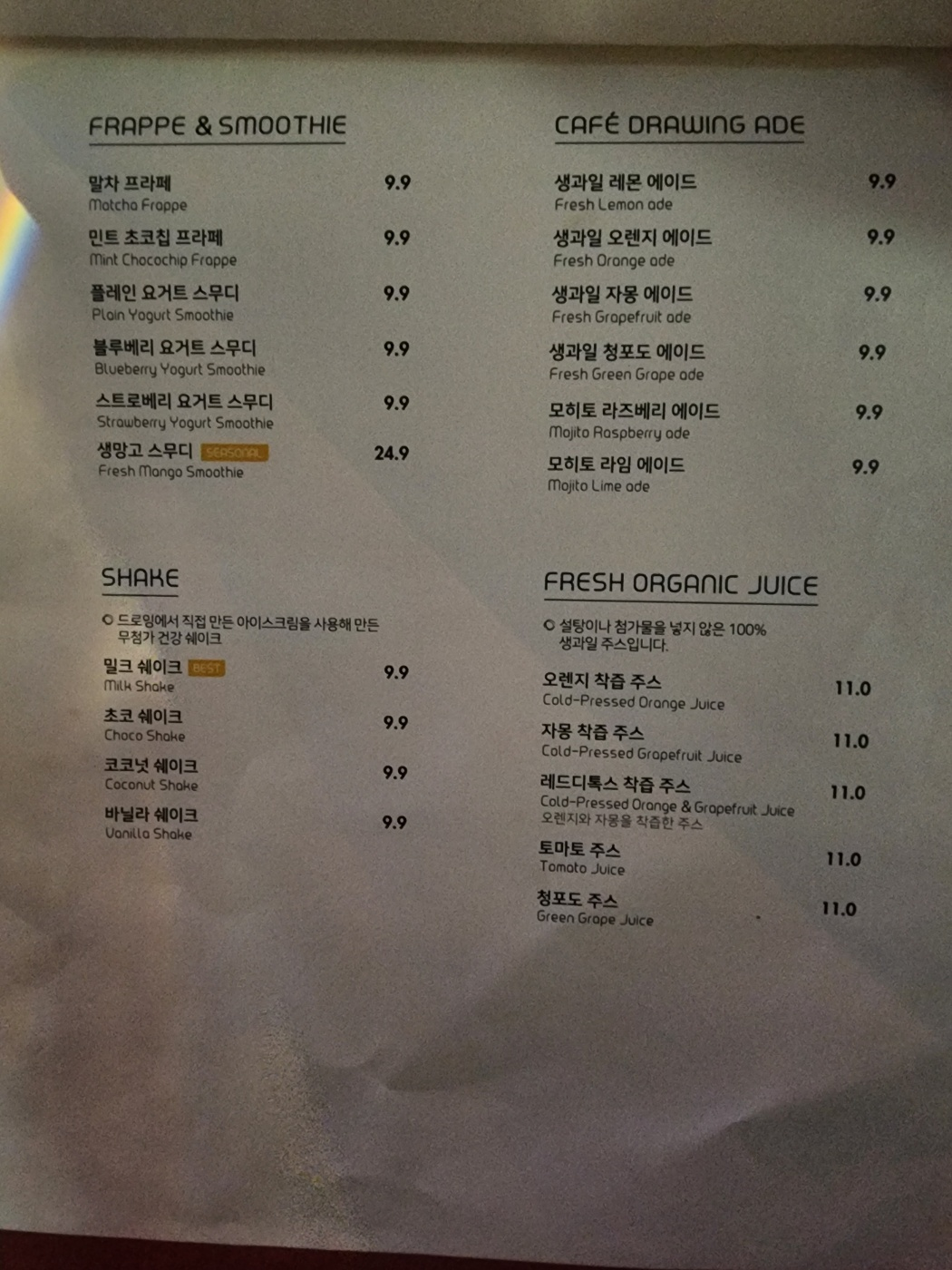 송파파크하비오 건물 1층에 있는 카페드로잉은 조명이 예쁘고 가게가 넓어서 지나다니면서 항상 방문해보려 했던 곳인데요, 평일 저녁에 가서 그런지 사람도 없고 조용하게 떠들고 놀기 좋았습니다. 1차로 주변에서 식사하고 2차로 간단하게 마시러 가기 안성맞춤이겠더라구요. 영업시간도 길어서 충분히 놀고 막차타고 집에 가기 좋습니다.